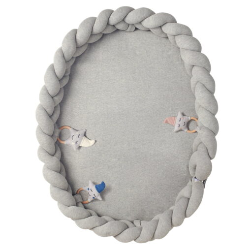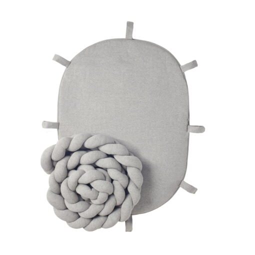 De gevlochten ledikantbumper is voorzien van een zacht gewatteerde speelmat, die ook te gebruiken is als aankleedkussen, onder de babygym of als kruipdeken.
